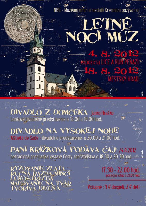 NBS – Múzeum mincí a medailí Kremnica všetkých srdečne pozýva na večernú prehliadku expozícií Mestského hradu, ktorá sa uskutoční v sobotu 18. augusta od 17.30 do 22.00 h. (posledný vstup o 21.00 h).