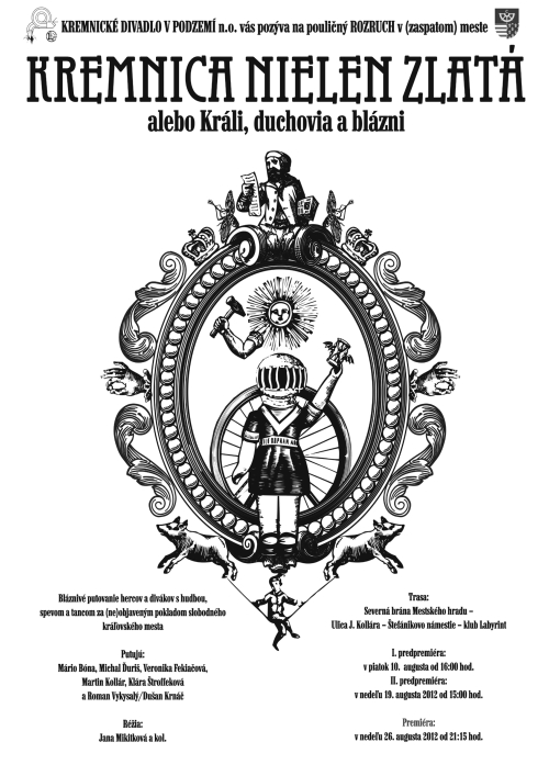 Kremnické divadlo v podzemí vás pozýva na pouličný ROZRUCH v (zaspatom) meste. Kremnica nielen zlatá, alebo Králi, duchovia a blázni je názov bláznivého putovania hercov a divákov s hudbou, spevom a tancom za (ne)objaveným pokladom slobodného kráľovského mesta. Premiéra sa uskutoční 15. septembra o 19.30.