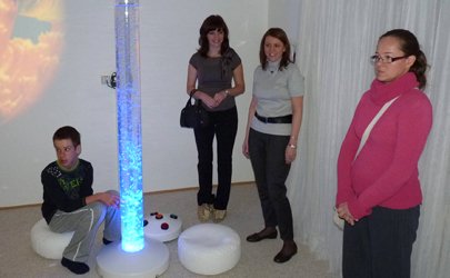 Psychologička školy Mgr. Filipová vysvetľuje princípy relaxácie v miestnosti Snoezelen. Na fotke je v strede Mgr. Miklošovičová, realizátorka projektu a Mgr. Utešená z Nadácie Dvojfarebný svet.